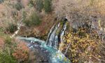 ・コバルトブルーの美瑛川へ流れ落ちる滝
